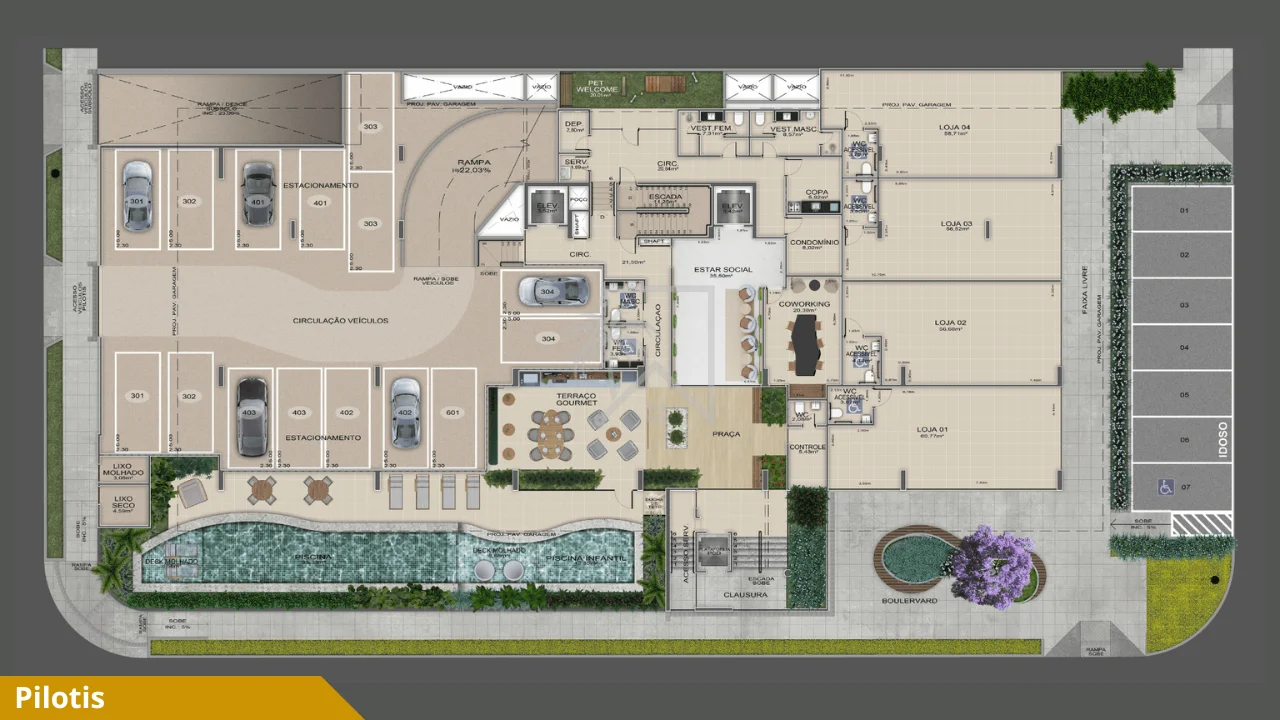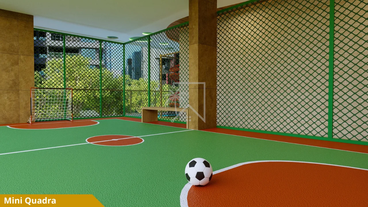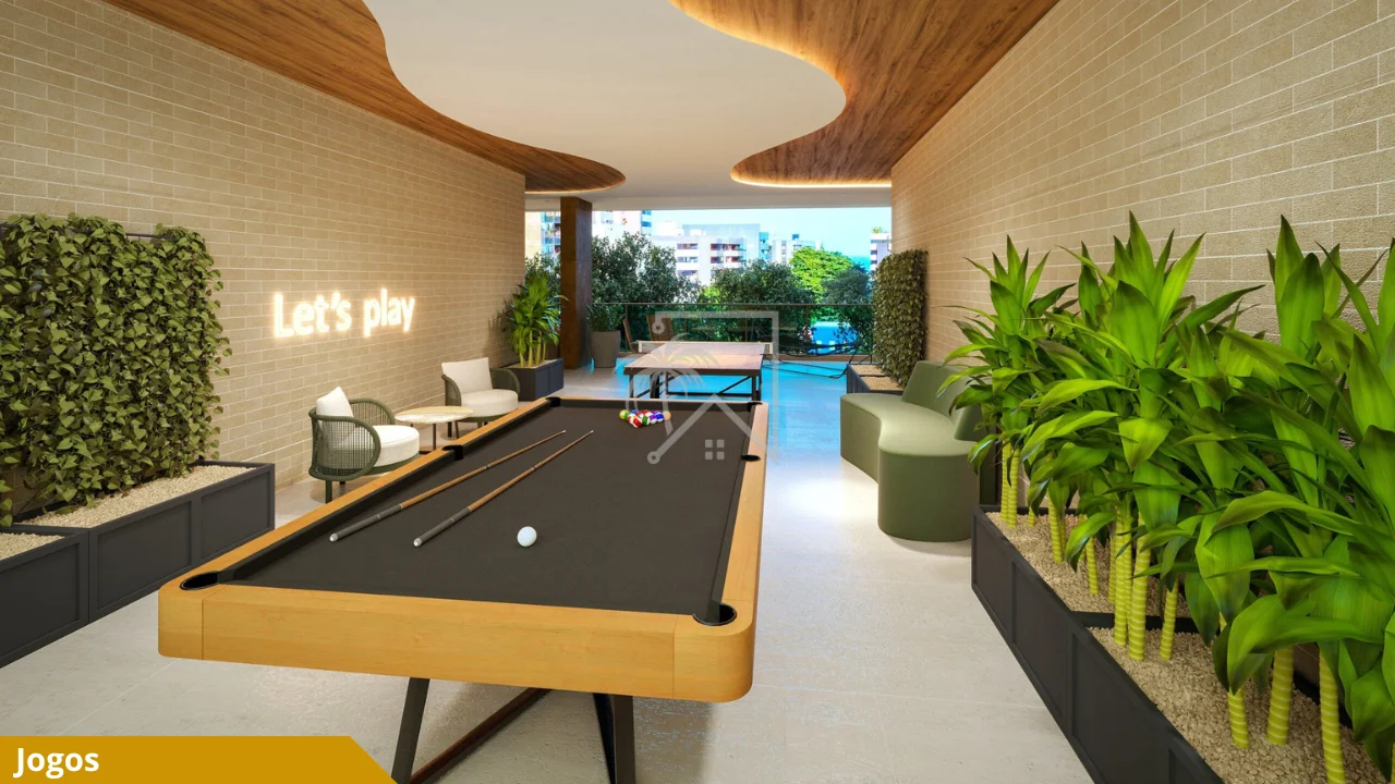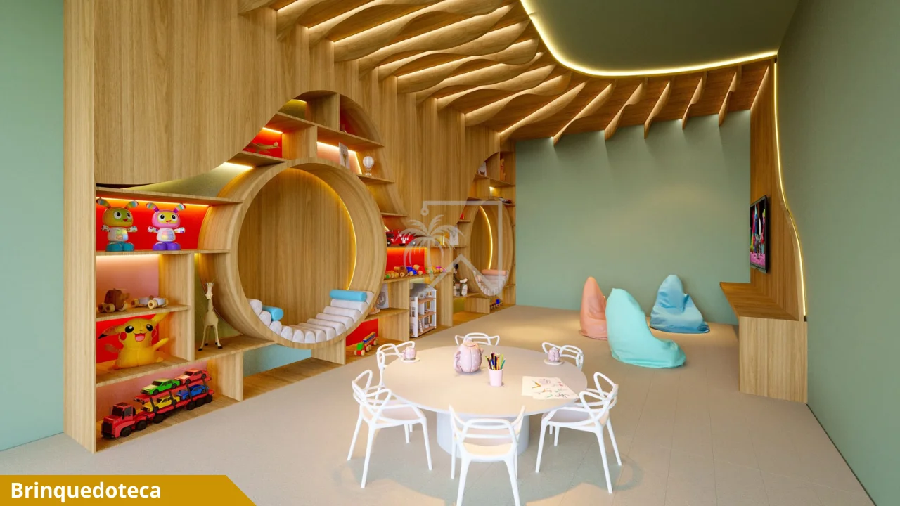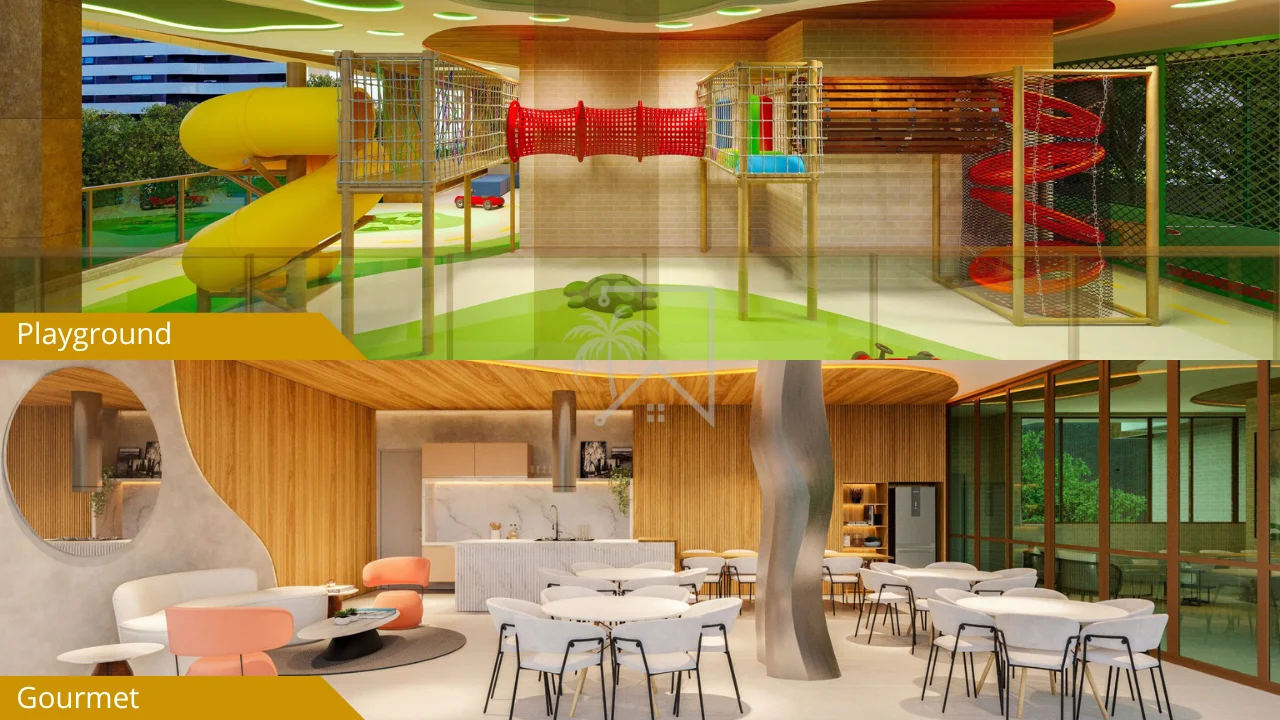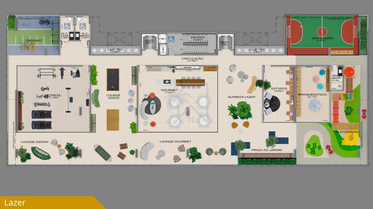 - Pavimento de lazer completo com piscina adulto e infantil, deck molhado, terraço gourmet, lounge gourmet e design, espaço games, coworking, brinquedoteca, miniquadra, playground, praça do jardim, academia, crossfit, salão de festas, salão de jogos e espaço pet e bike