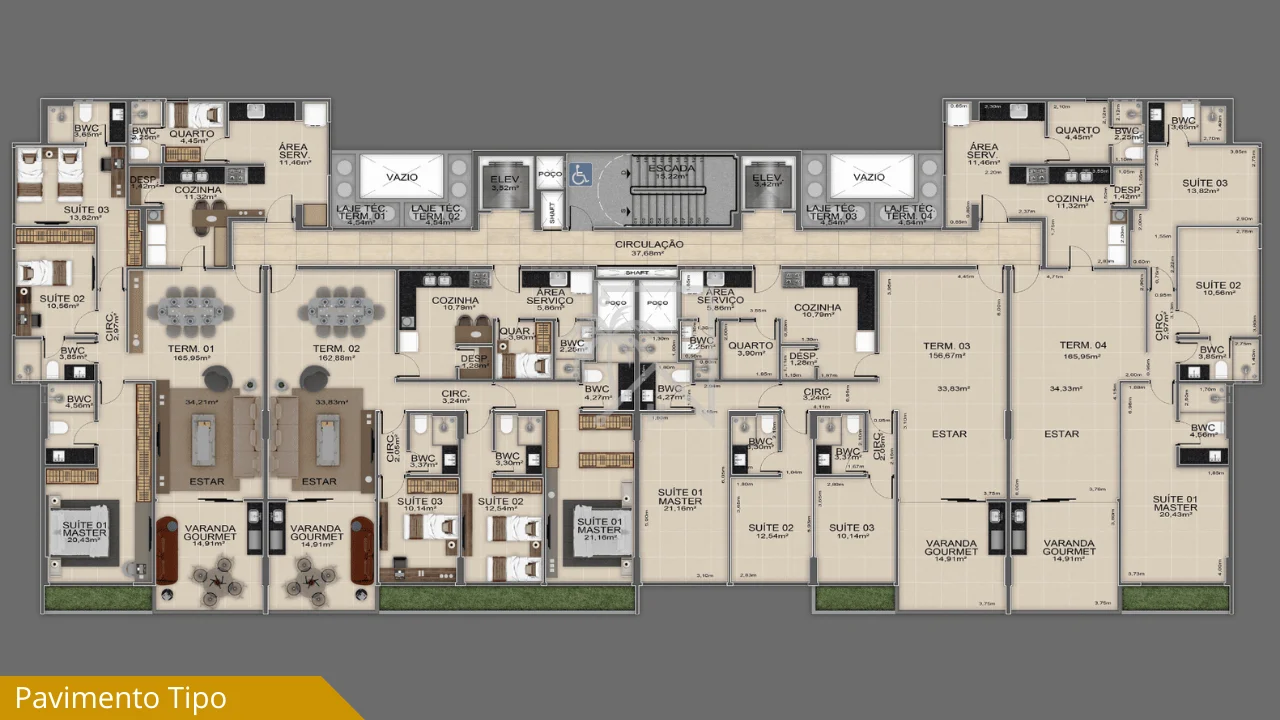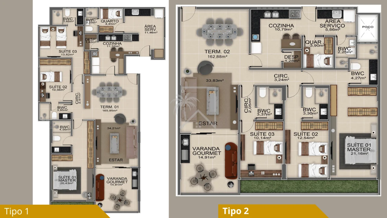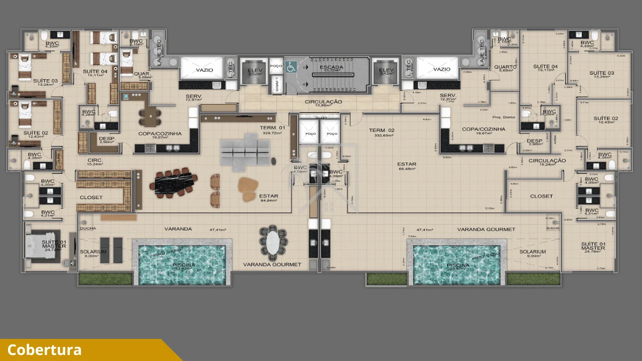 | Cobertura Garden | 329–332 | 4 suítes | 4 | Inclui piscina na varanda |