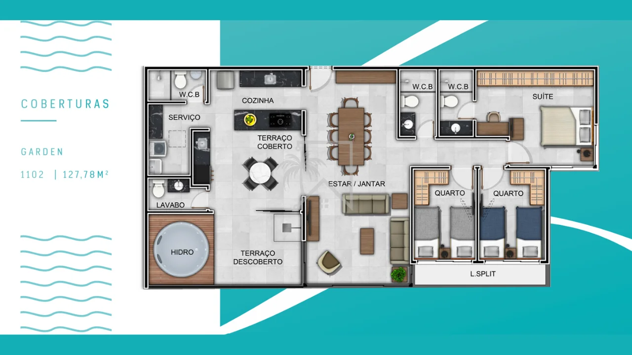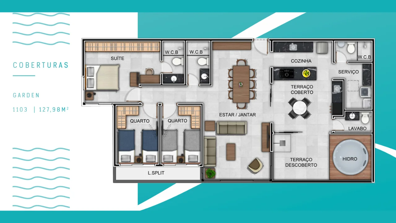 • 3 quartos, sendo 1 suíte