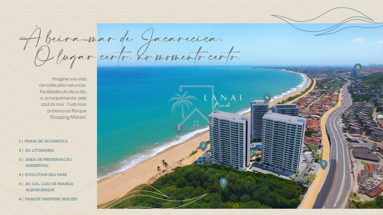 O Lanai Beach é um lançamento exclusivo da Moura Dubeux em Jacarecica, Maceió, que une sofisticação, conforto e localização privilegiada. Um condomínio à beira-mar com vista definitiva para o oceano, perfeito para quem busca morar ou investir em um dos bairros que mais se valorizam na capital alagoana.