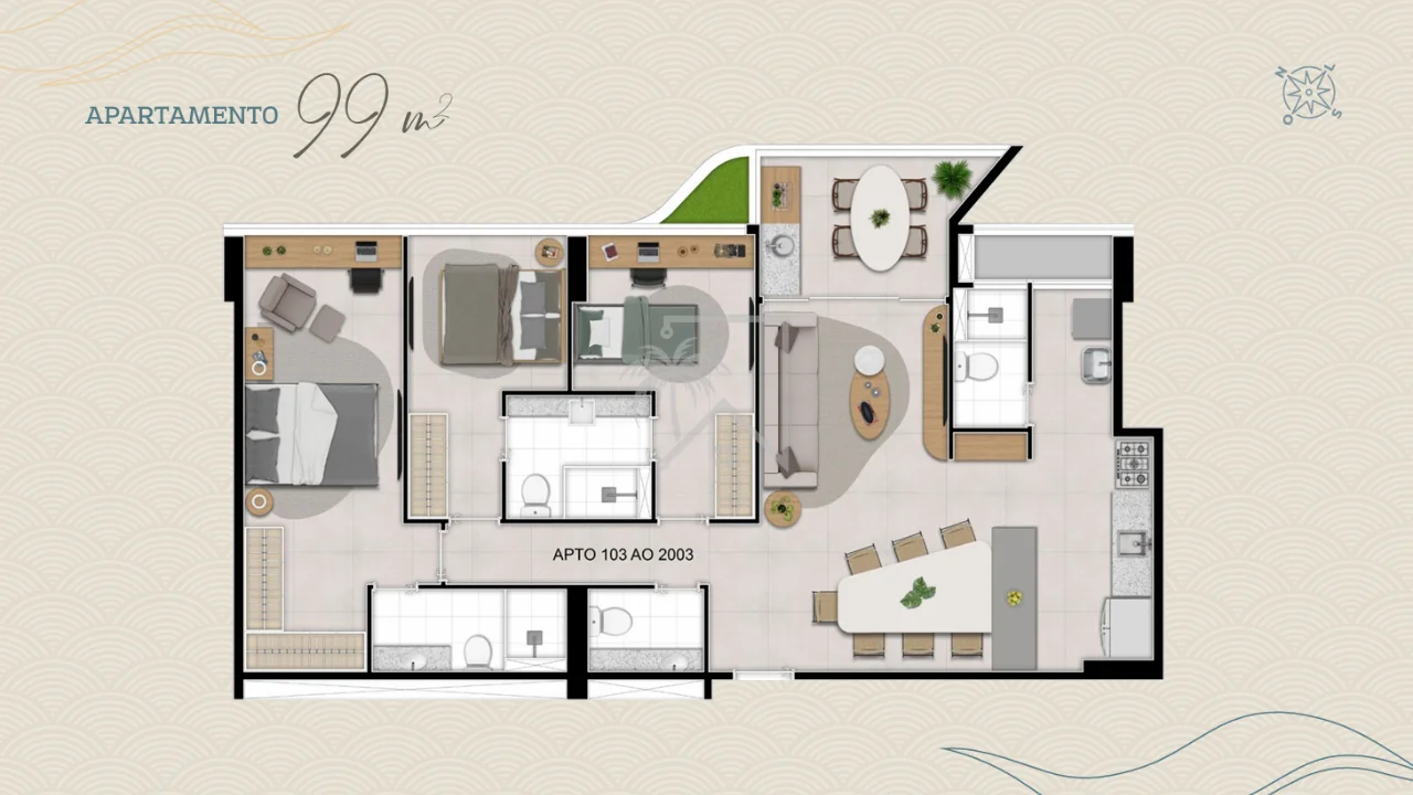 - 99 m² – 3 suítes (2 reversíveis), lavabo – 1 a 2 vagas