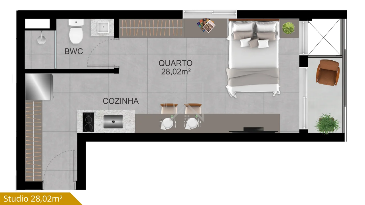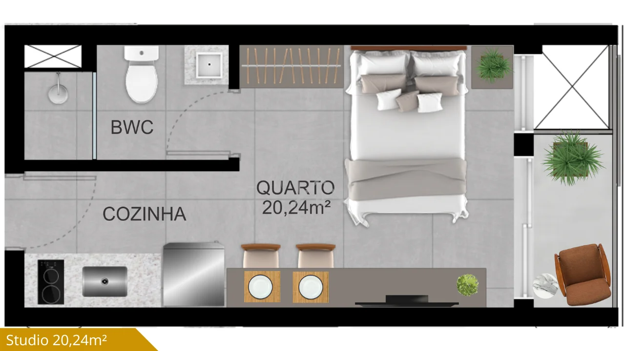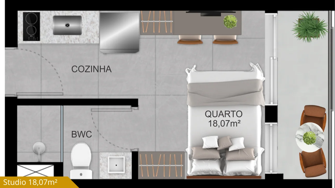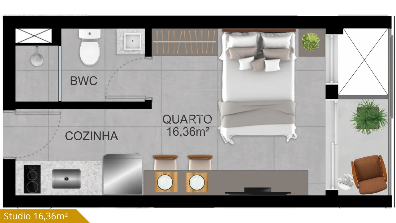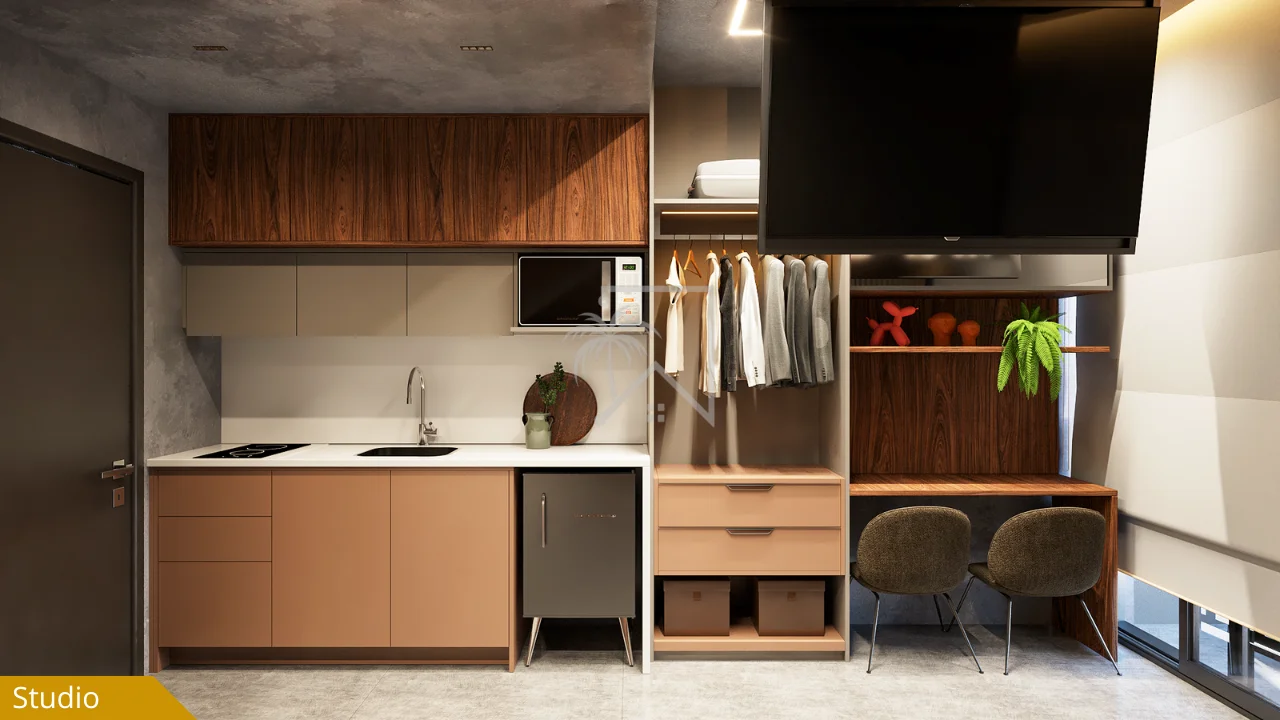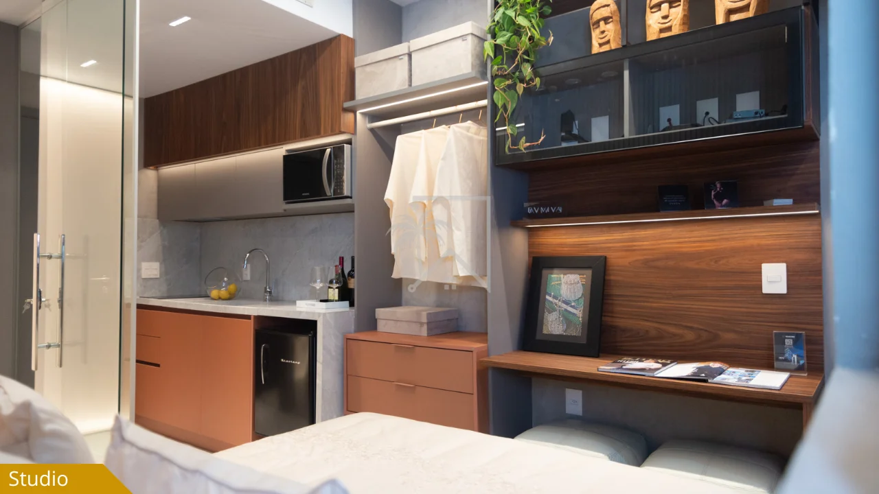 - Studios compactos, com excelente aproveitamento de área