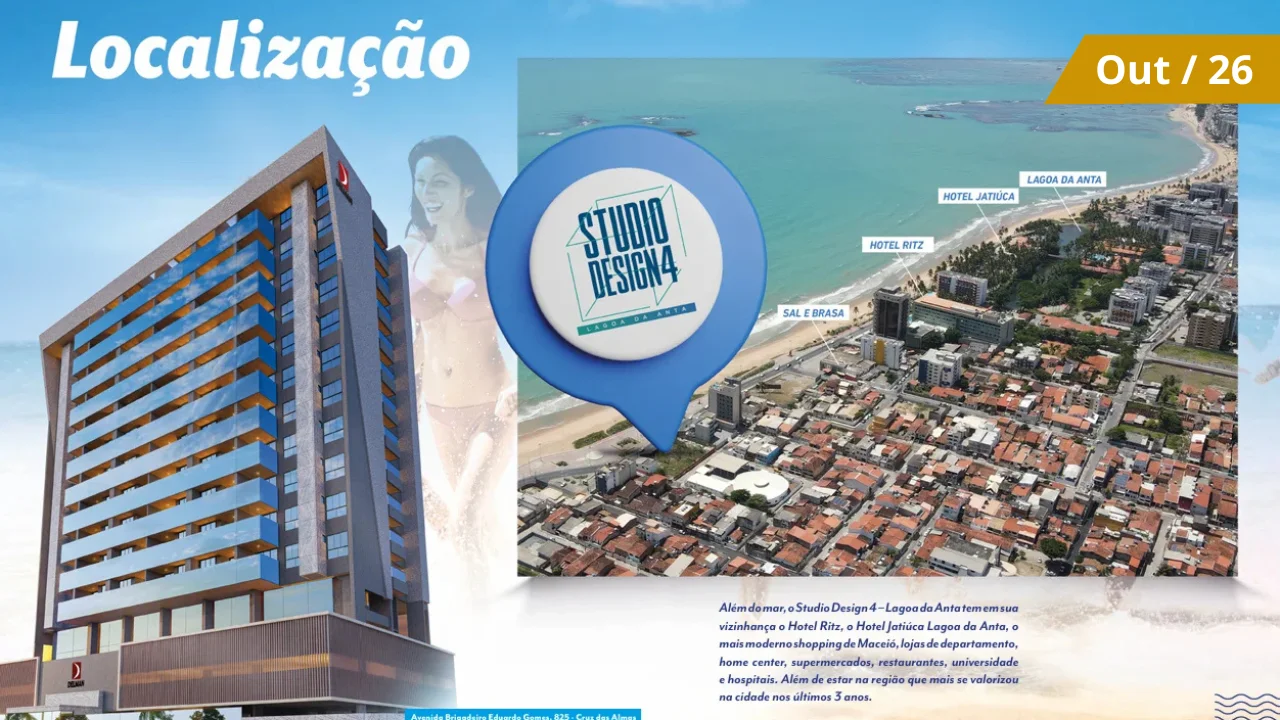 O Studio Design 4 Seu Apartamento para alugar em Maceio é o mais recente lançamento da construtora Delman, situado na Avenida Brigadeiro Eduardo Gomes, 825, no bairro Cruz das Almas, Maceió/AL. Inspirado no sucesso de seus predecessores, este empreendimento oferece modernidade, praticidade e uma vista deslumbrante para o mar da praia de Lagoa da Anta.